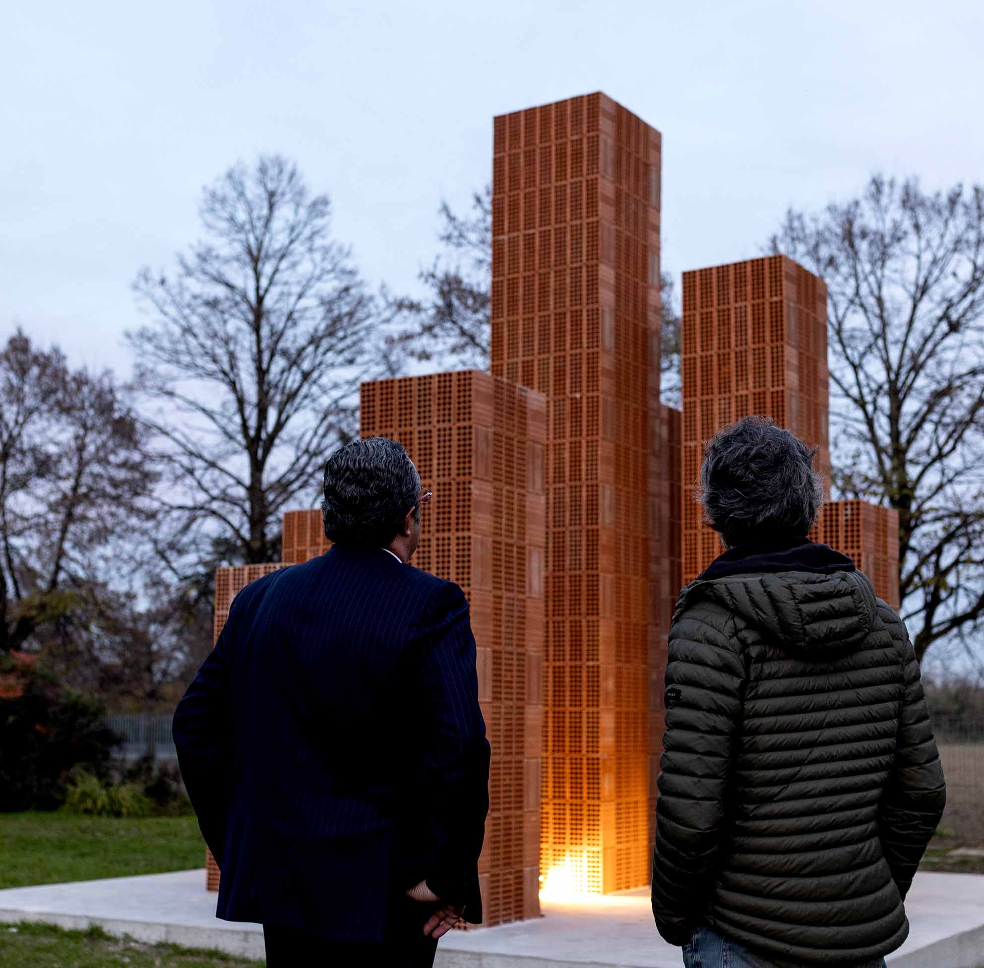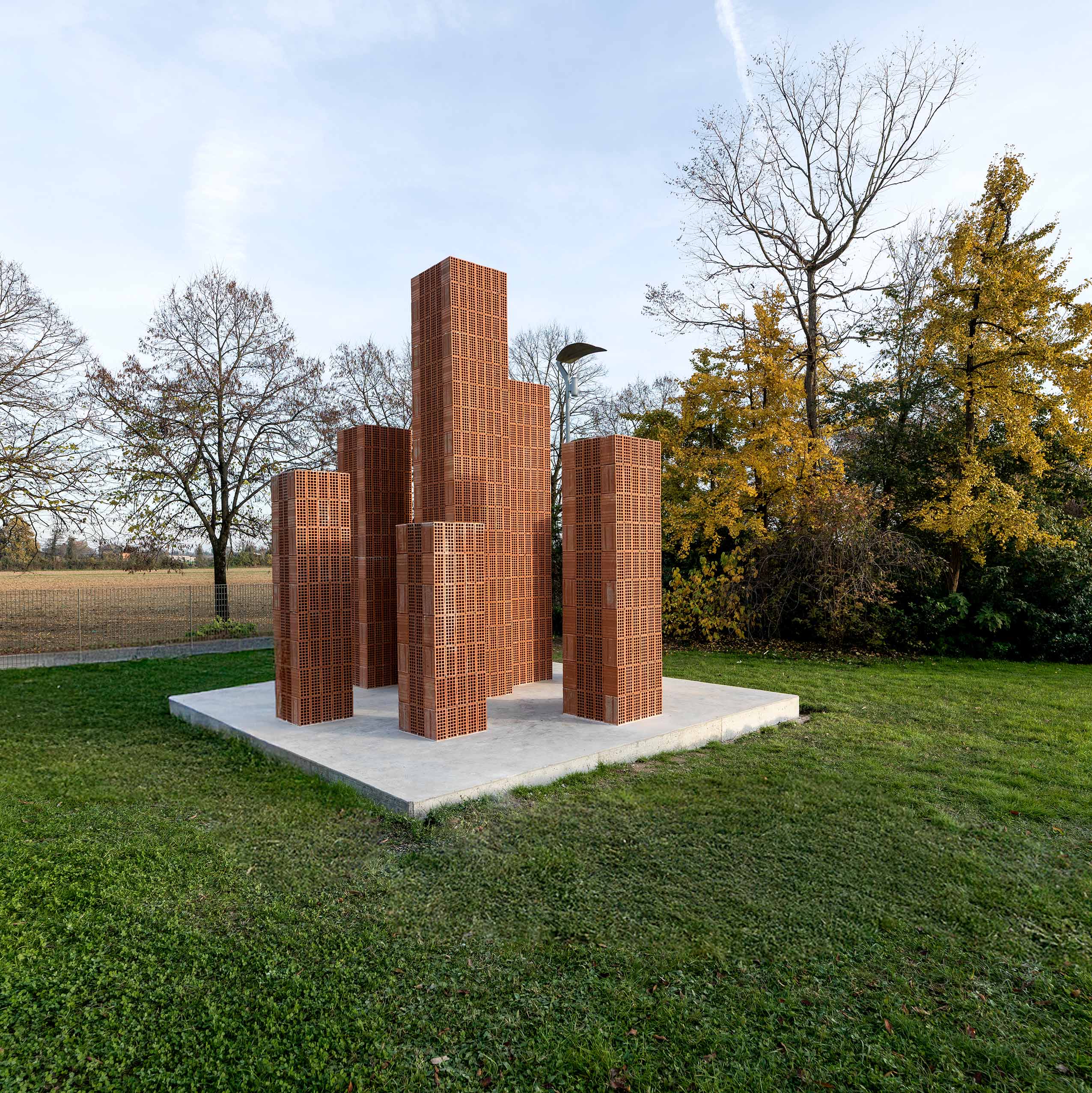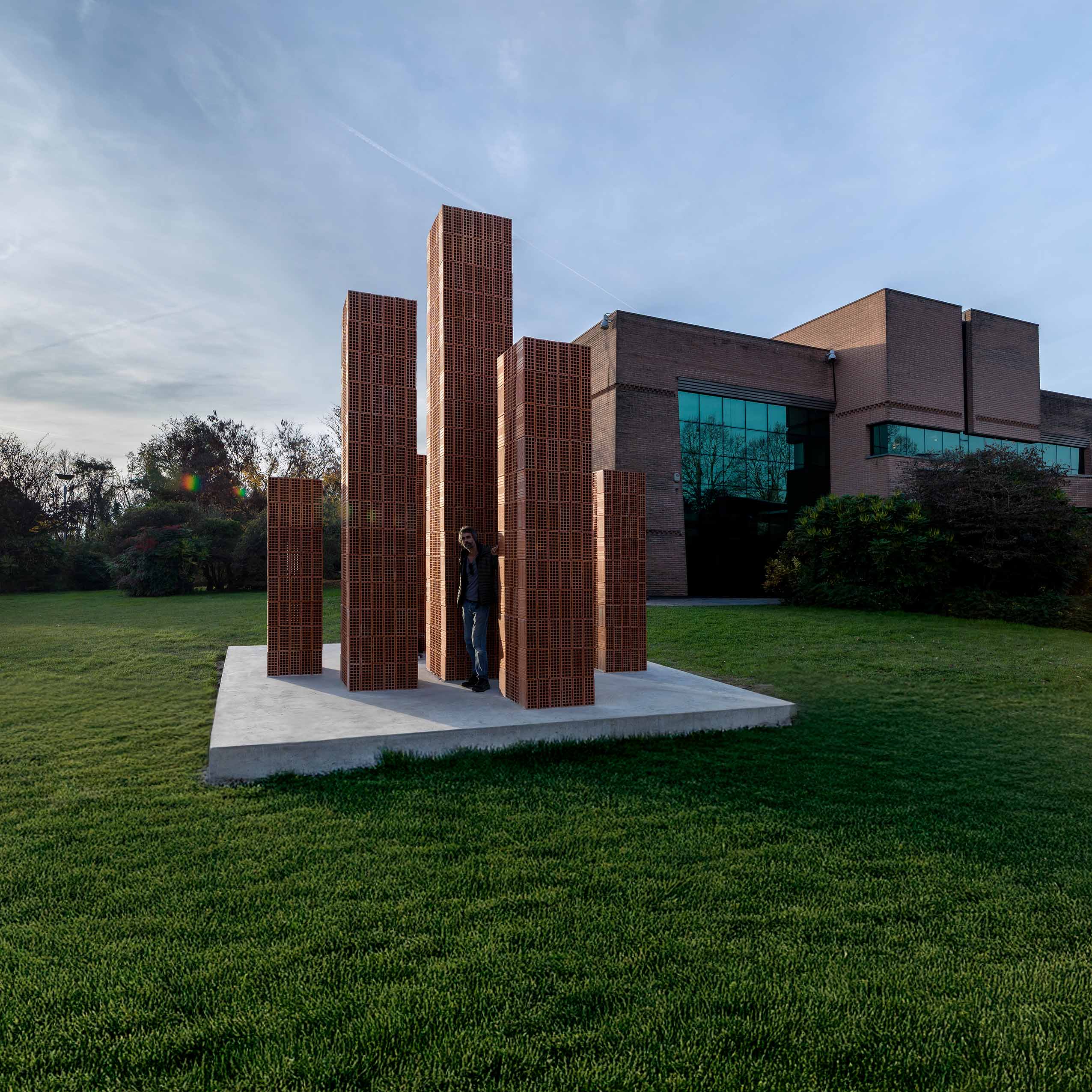 Nell’Installazione site specific pensata per il parco della DANESI, ho immaginato un’opera che dialoga con lo spazio circostante e soprattutto con l’architettura in mattoni faccia a vista dell’azienda. L’architettura della DANESI è ispirata alla forma del Forno Hoffman, come se la struttura in se’ rivelasse già la natura intrinseca e la vocazione dell’azienda. La funzione dell’edificio ne determina la forma. Il forno quindi si riattualizza e diventa altro: stanze, uffici, relazioni, amicizie, obiettivi, sconfitte, vittorie; in una parola, vita.