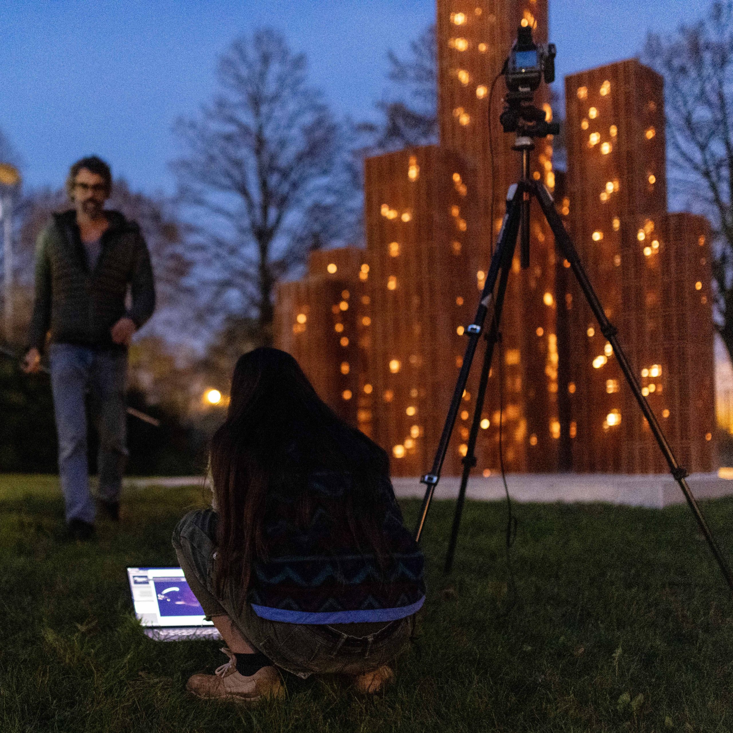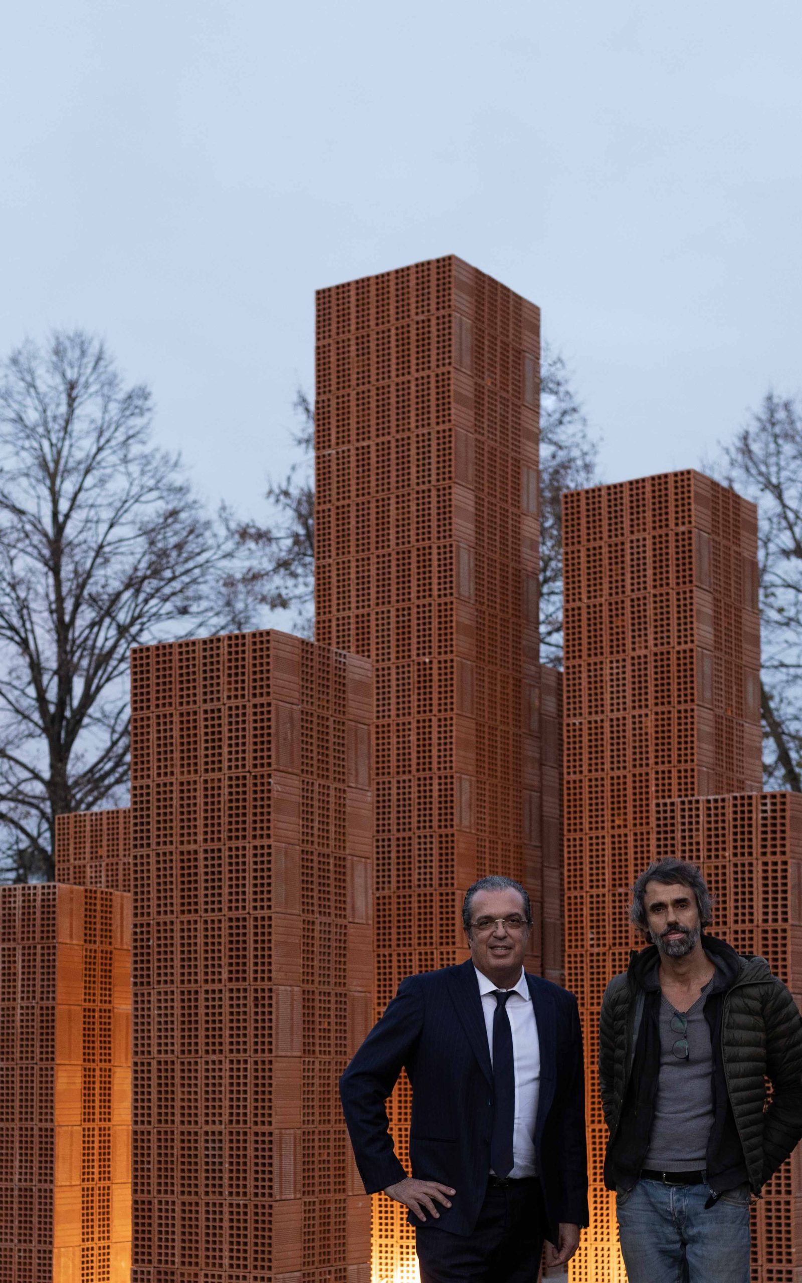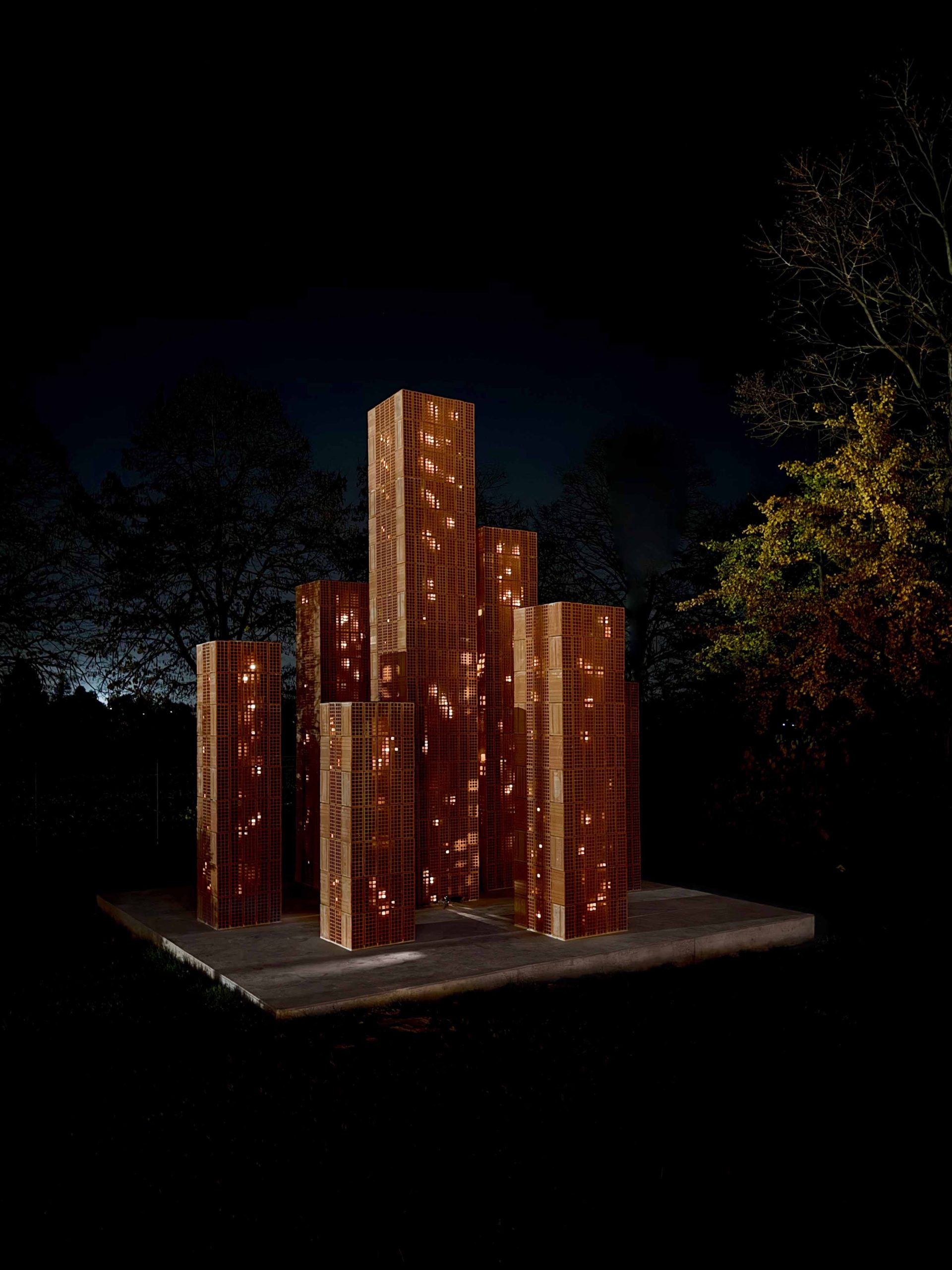 Le torri saranno appoggiate a un basamento di cemento a vista (come gli inserti architettonici dell’edificio) che avrà anche la funzione di dare stabilità alla struttura, nascondere l’impianto di illuminazione e funzionare come piedistallo dell’opera.