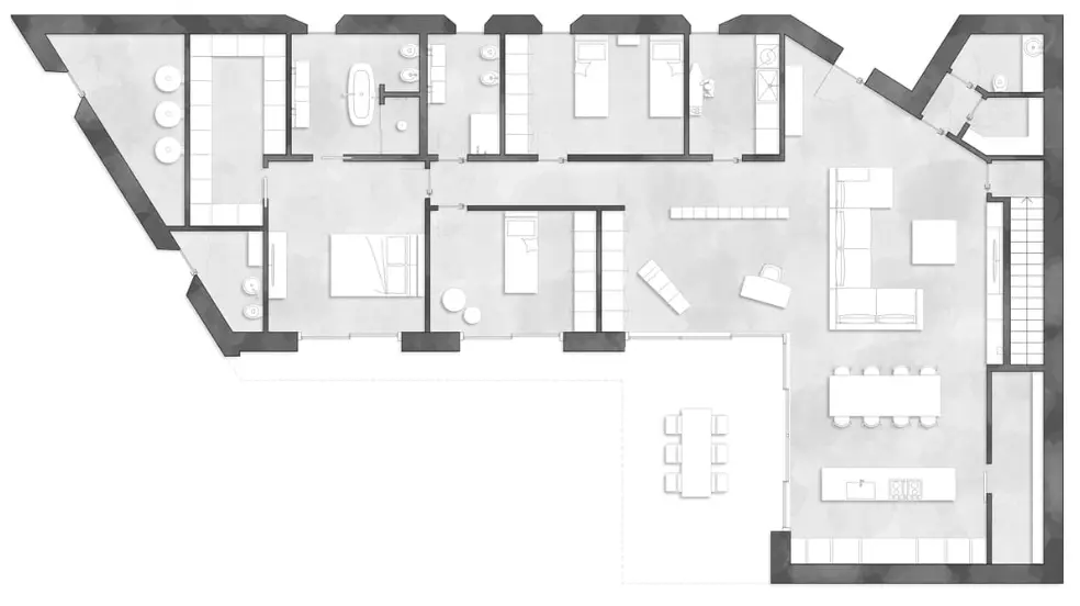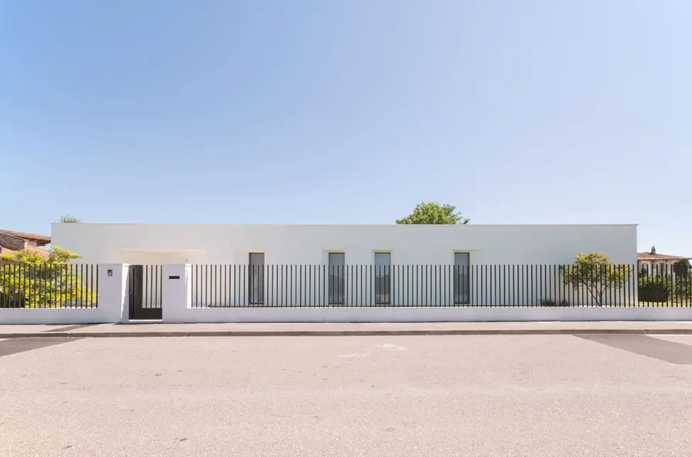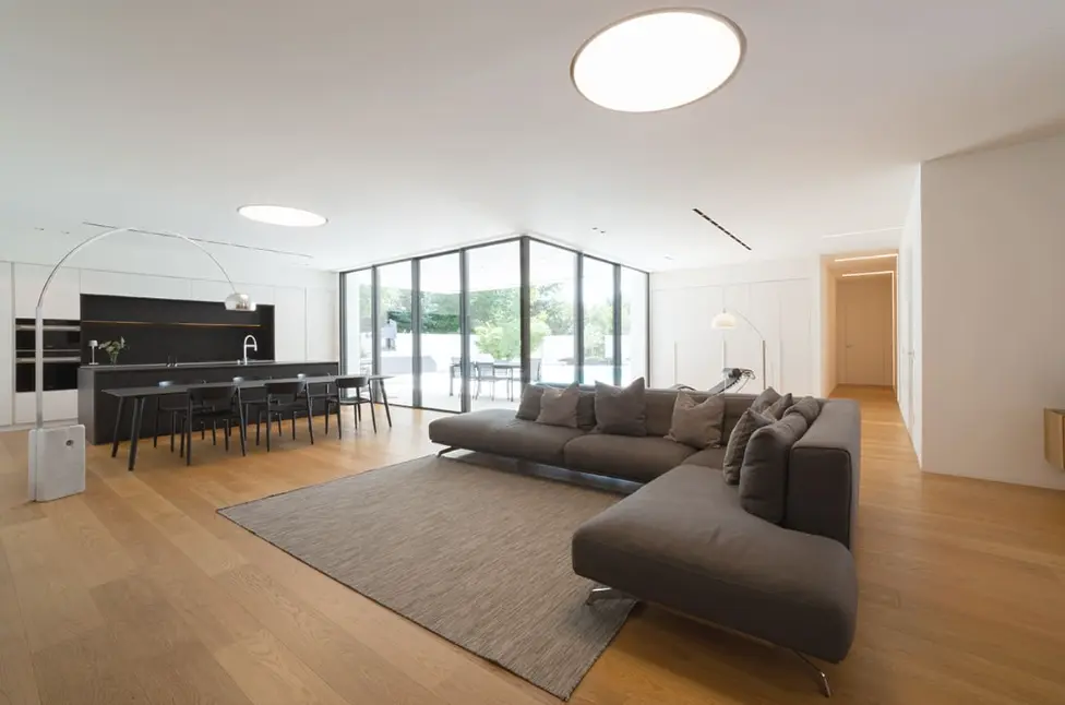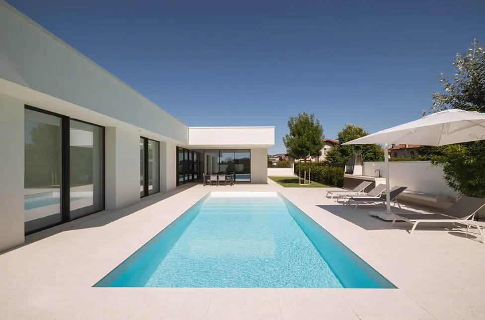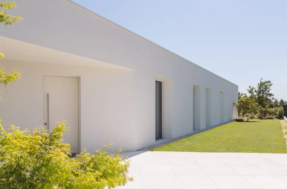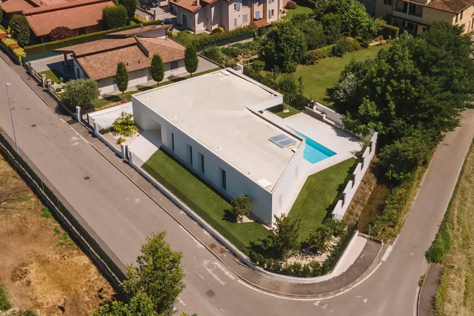 Il concept architettonico deriva dall’intersezione di due volumi lineari orientati secondo le direttrici del lotto, che generano una configurazione angolare dell’edificio. All’interno di ciascun volume sono organizzati spazi giorno open-space e ambienti notte, definendo il giardino e offrendo una vista continua verso l’area piscina. Le ampie superfici vetrate annullano la percezione del confine tra interno ed esterno, garantendo un’elevata illuminazione naturale degli ambienti. Il prospetto nord, affacciato sulla strada, è caratterizzato da aperture a tutta altezza con imbotti svasati, studiate per favorire l’ingresso della luce naturale mantenendo al contempo un adeguato livello di privacy.