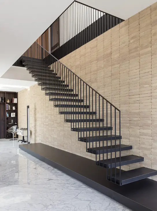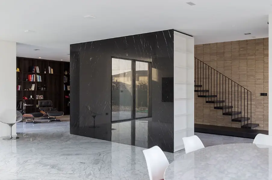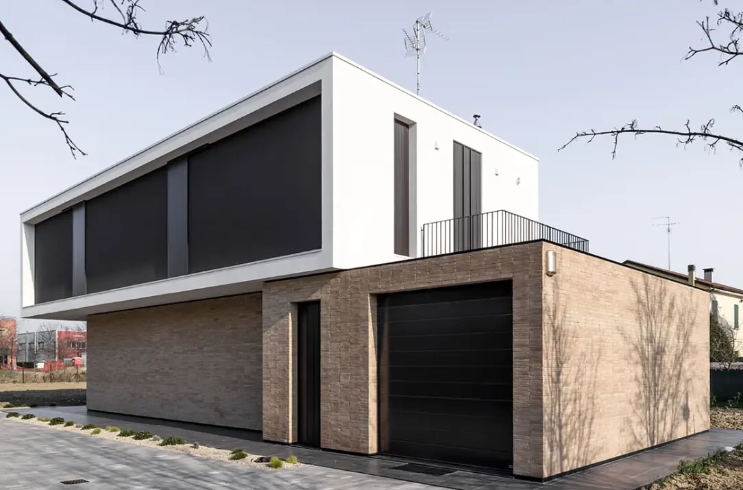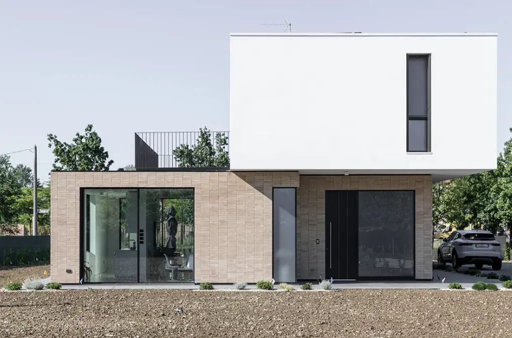 Il concept progettuale si sviluppa attraverso la composizione di due volumi distinti: un basamento rivestito in mattoni faccia vista, che accoglie gli ambienti della zona giorno, e un volume superiore di forma parallelepipeda, caratterizzato da finitura bianca, destinato alla zona notte.